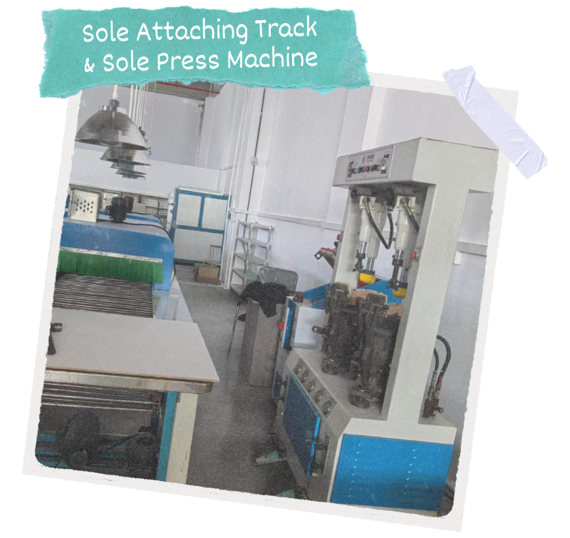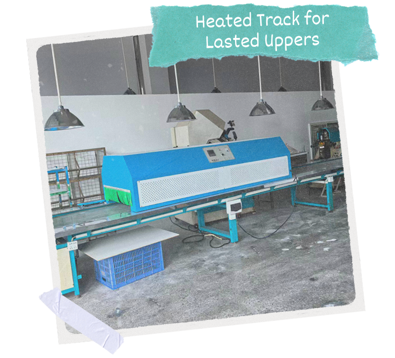 After the lasting process, the underneath of the lasted uppers are prepared with cement (glue) ready to have the soles attached. They then pass through a heated chamber to activate the glue.