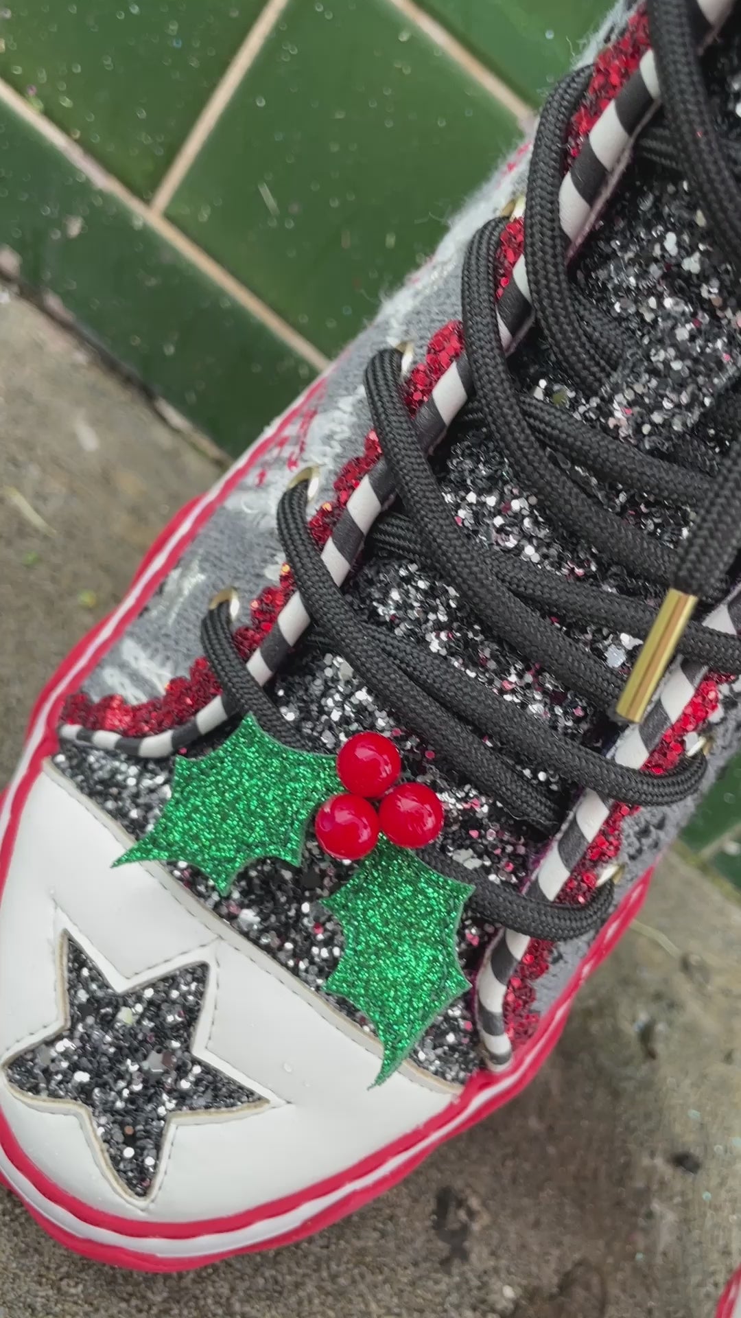 Step into Christmas in style with our black, grey and white Fairisle high top trainers, decked out with a black and silver glitter tongue and matching star on the toe, a cheeky-looking Father Christmas sits on the heel, wearing his red glitter Santa hat with 3D pom pom. The Christmas feel is completed with black and white candy cane piping, red glitter scalloping and a removable bough of holly on the matching black laces.