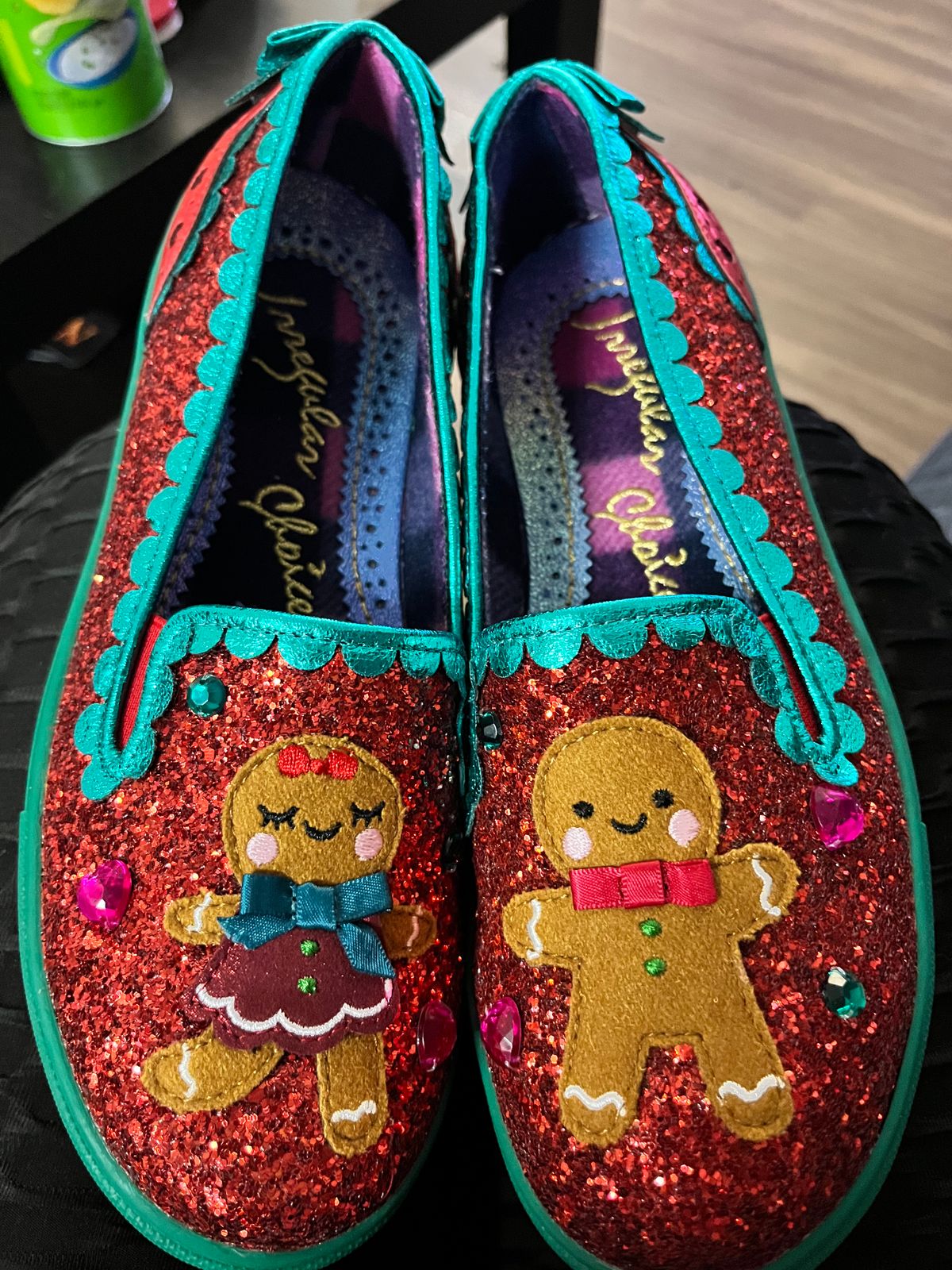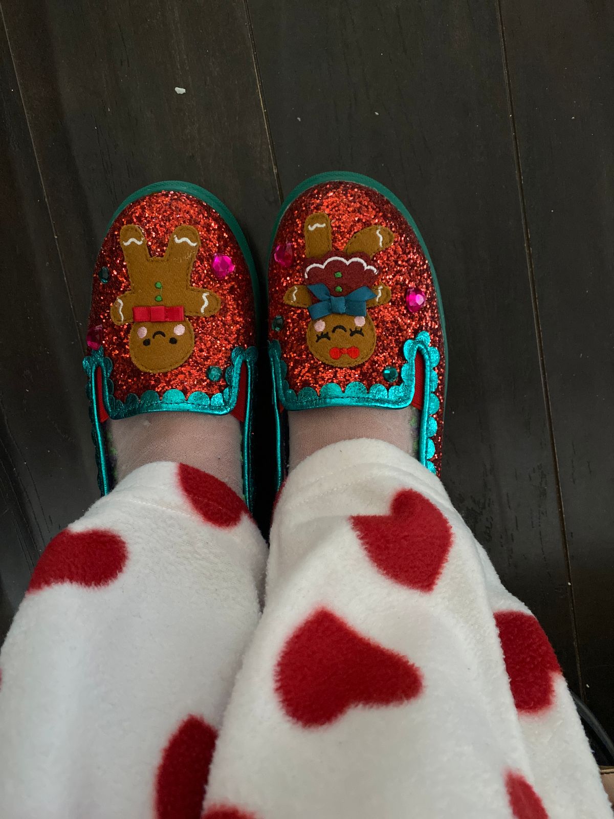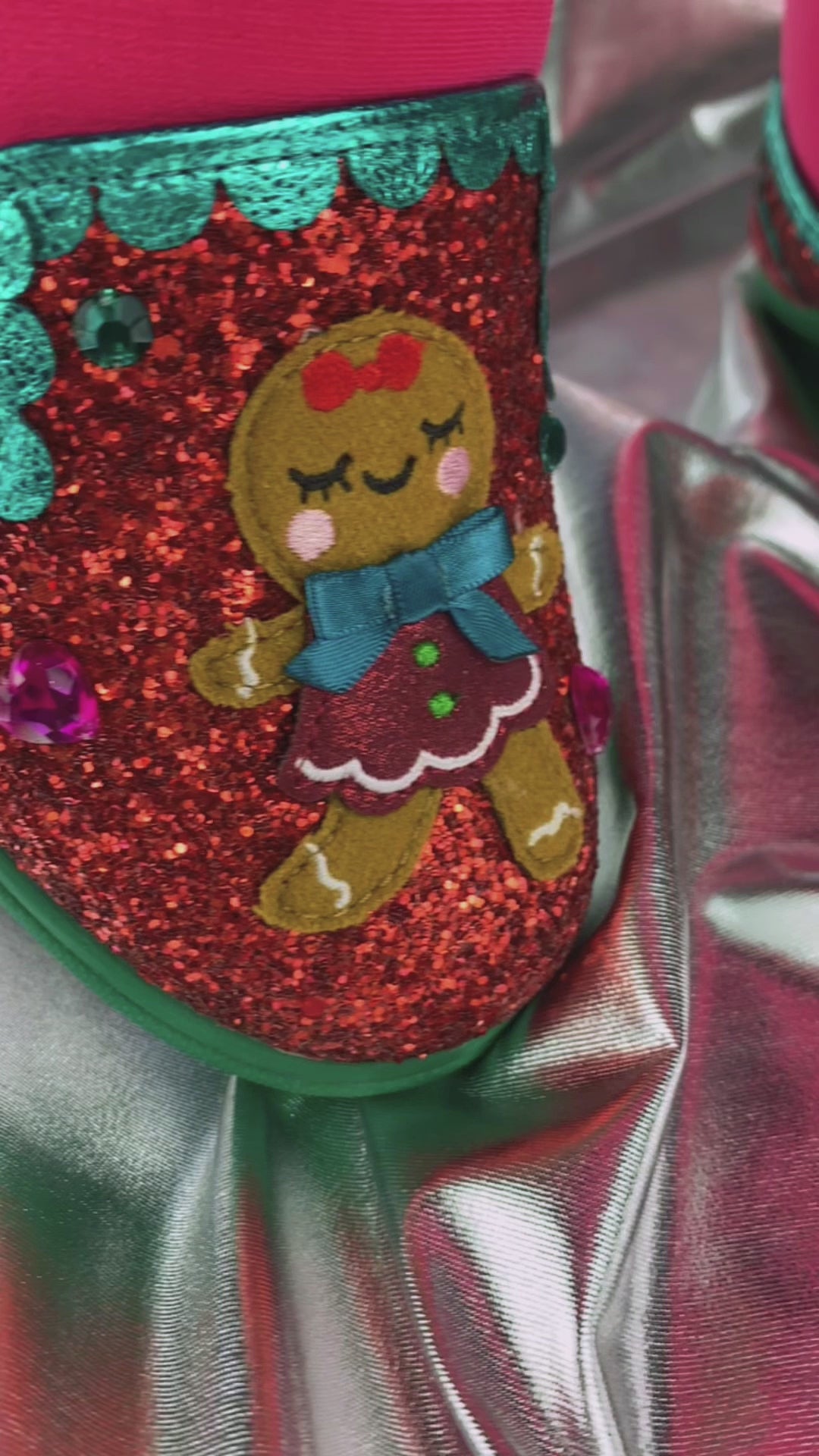 The gingerbread couple are the stars of these super glittery red sequin trainers. With contrasting metallic teal scalloped piping, cut bow on the heel and green and pink gems, they will have you saying 'not the gumdrop buttons'! Run into the festive season with these slip on trainers!