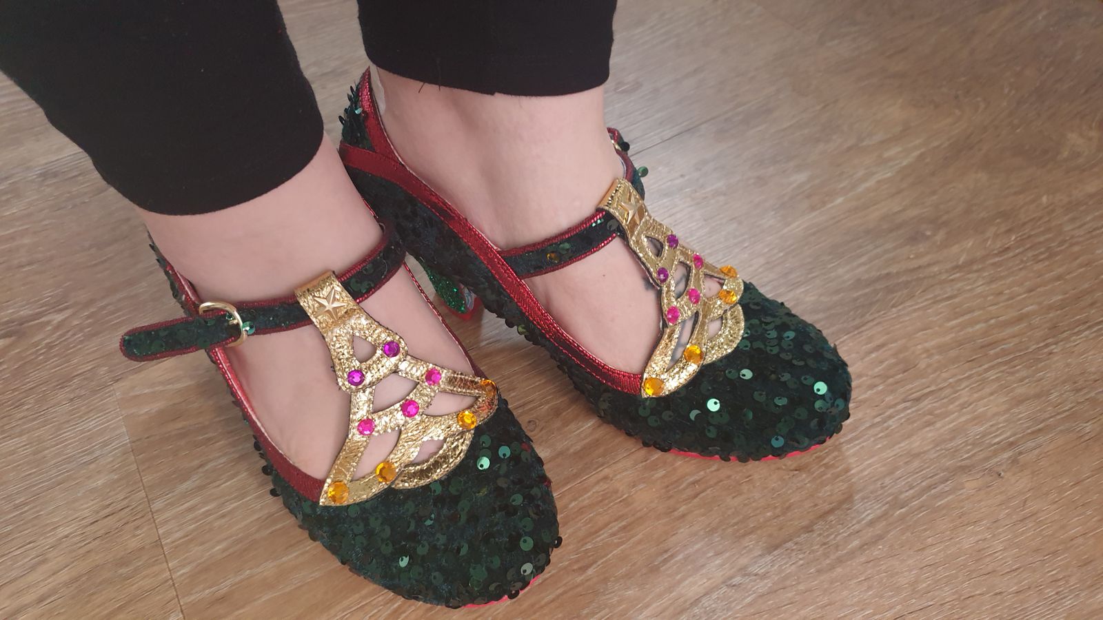 Are you ready to decorate? These shoes have already done it for you! Featuring a statement T-bar strap that looks like a Christmas tree, bedazzled with mini decorations and mounted onto a sparkling red upper, these shoes are sure to spread festive cheer wherever you go!